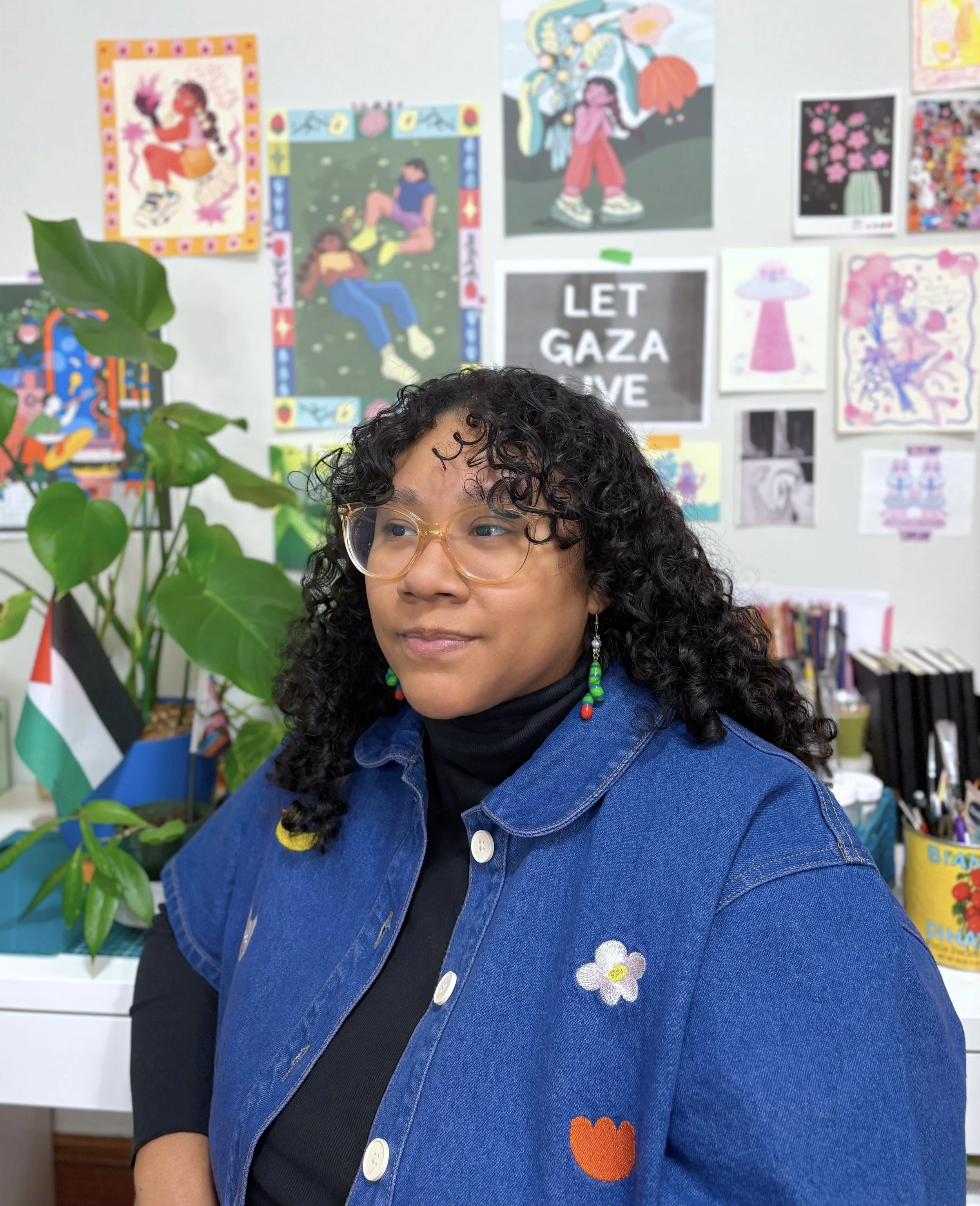 Their practice is rooted in preservation and visual storytelling that affirms identity, nurtures resilience, and reimagines liberation for QTBIPOC, especially queer black joy. Through portraiture and organic forms, they explore how grief, joy, and vulnerability coexist in daily life. Recurring motifs showcase growth and the presence of lived experience, while many portraits center people of color, often self-portraits, as acts of preservation and visibility. Preservation runs through their work, honoring cultural and familial histories, sustaining community voices, and practicing self-preservation as a Black genderqueer woman navigating erasure and harm.